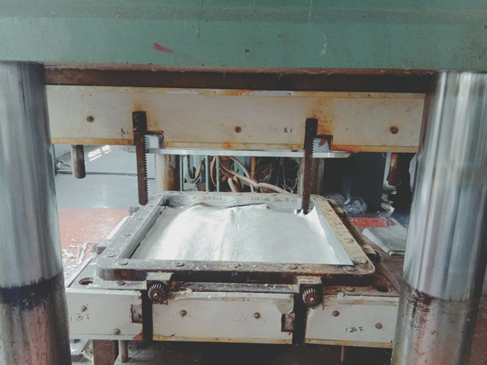 經過熟化期的片材就可以放入模壓機進行模壓了,在模壓之前要嚴格稱重每塊水箱板需要的片材重量,以每塊水箱板都是標準重量。進入模壓機之前還要把包裹片材的塑料膜撕下,才能放入模壓機。
